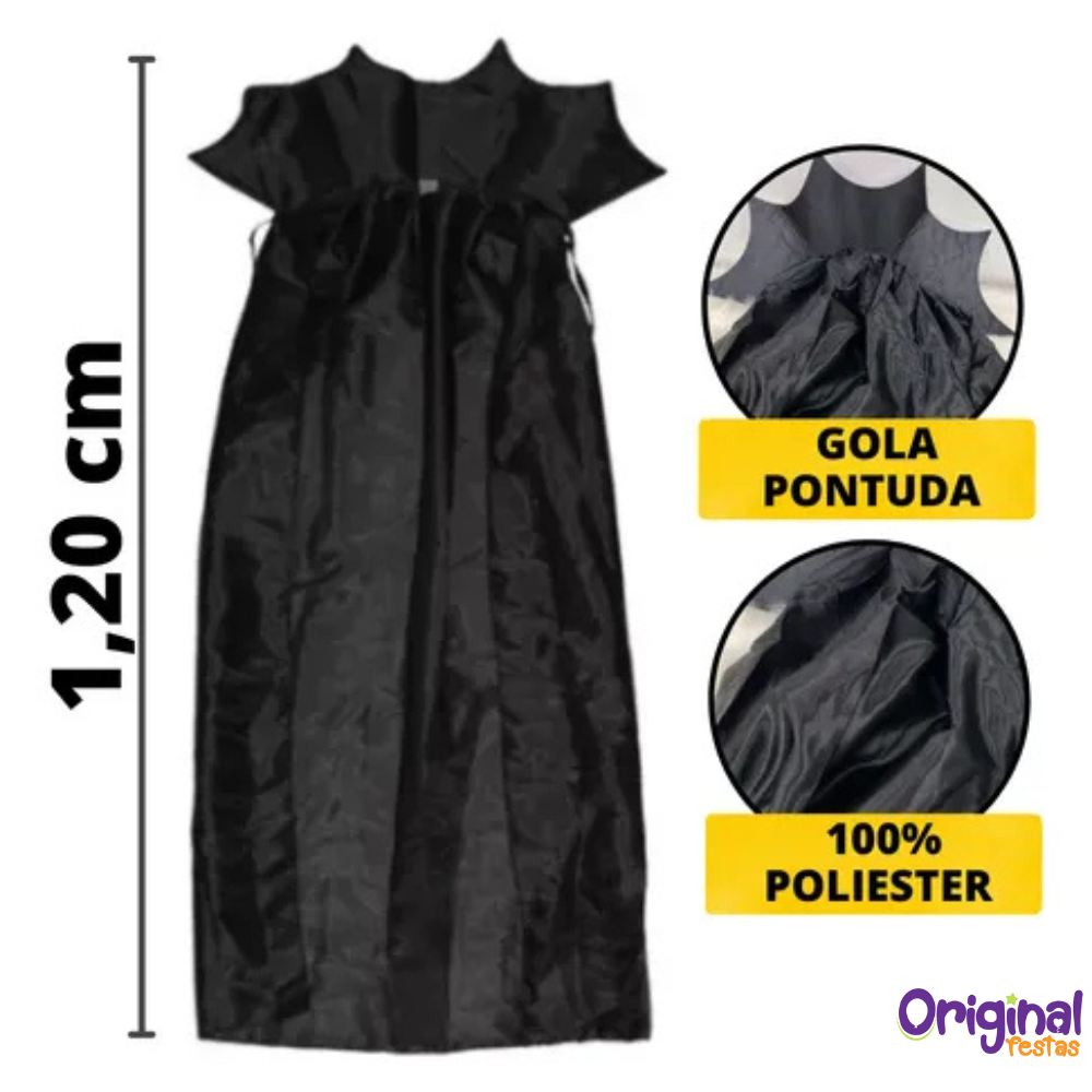 Dê um toque de mistério e elegância ao seu visual com a Capa Halloween com Gola Pontuda, perfeita para compor fantasias de bruxa, vampiro, malévola ou qualquer personagem sombrio! Ideal para festas à fantasia, Halloween e eventos temáticos.