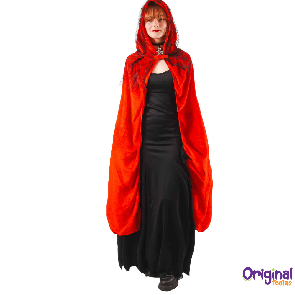 Transforme seu visual com elegância e mistério usando a Capa de Veludo com Capuz Adulto! Um acessório versátil e sofisticado, ideal para compor fantasias de bruxa, vampira, capuchinho ou personagens místicos.