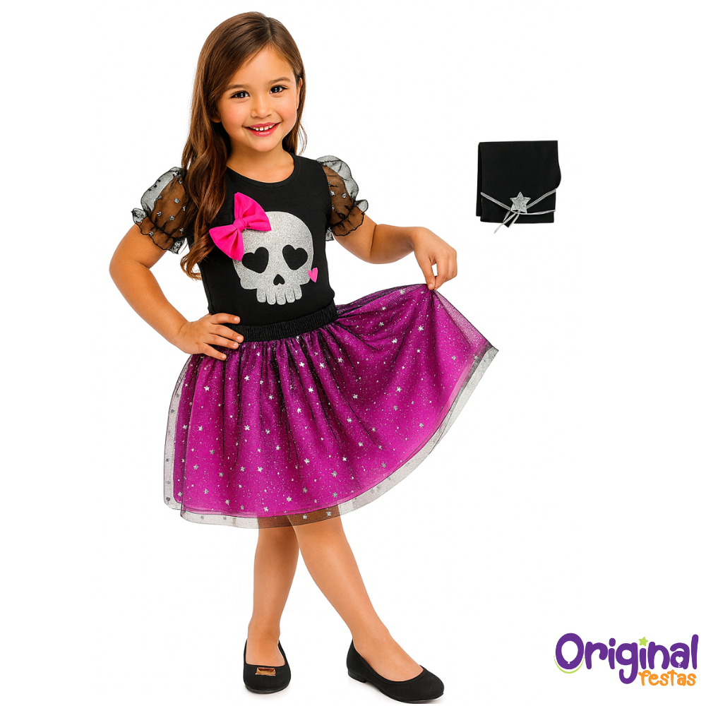 O vestido combina o preto elegante com o roxo vibrante e detalhes prateados, destacando a estampa de caveira com laço rosa — símbolo de atitude e charme! As mangas bufantes em tule com glitter e a saia rodada com estrelas prateadas dão um toque mágico ao visual, garantindo movimento e delicadeza em cada passo.