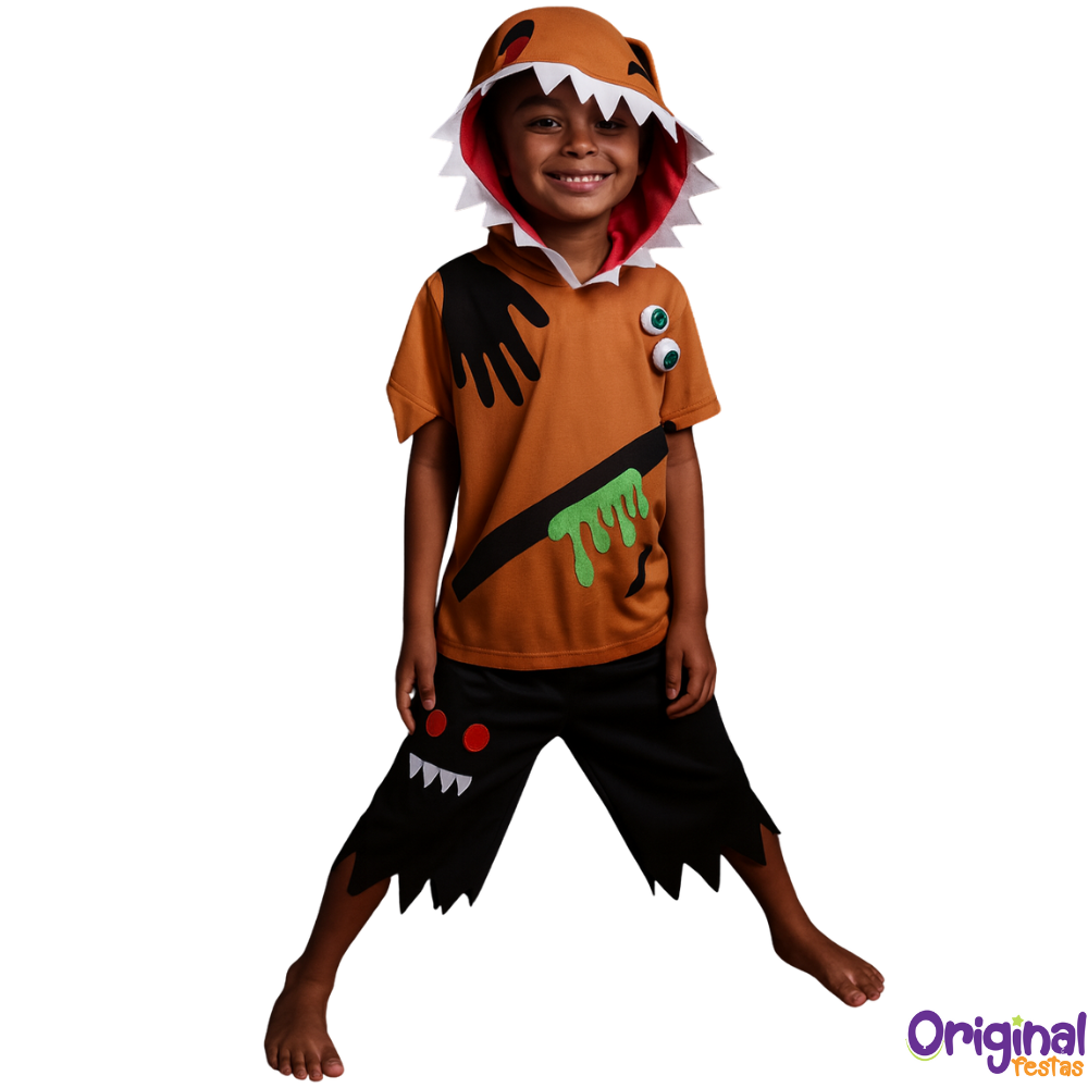 Composta por blusa de capuz com dentes e olhos aplicados e bermuda preta com detalhes coloridos, é uma opção leve, divertida e fácil de vestir — perfeita para os pequenos soltarem a imaginação e se transformarem em monstrinhos simpáticos!