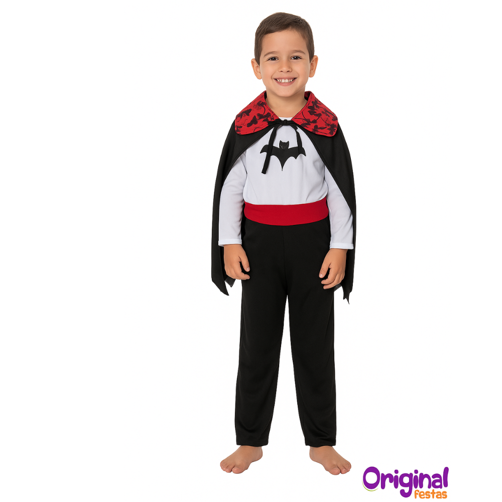 Composta por uma blusa branca com detalhe de morcego no peito, calça preta confortável, capa preta com gola vermelha estampada e cinto vermelho, essa fantasia traz o equilíbrio ideal entre estilo e diversão.