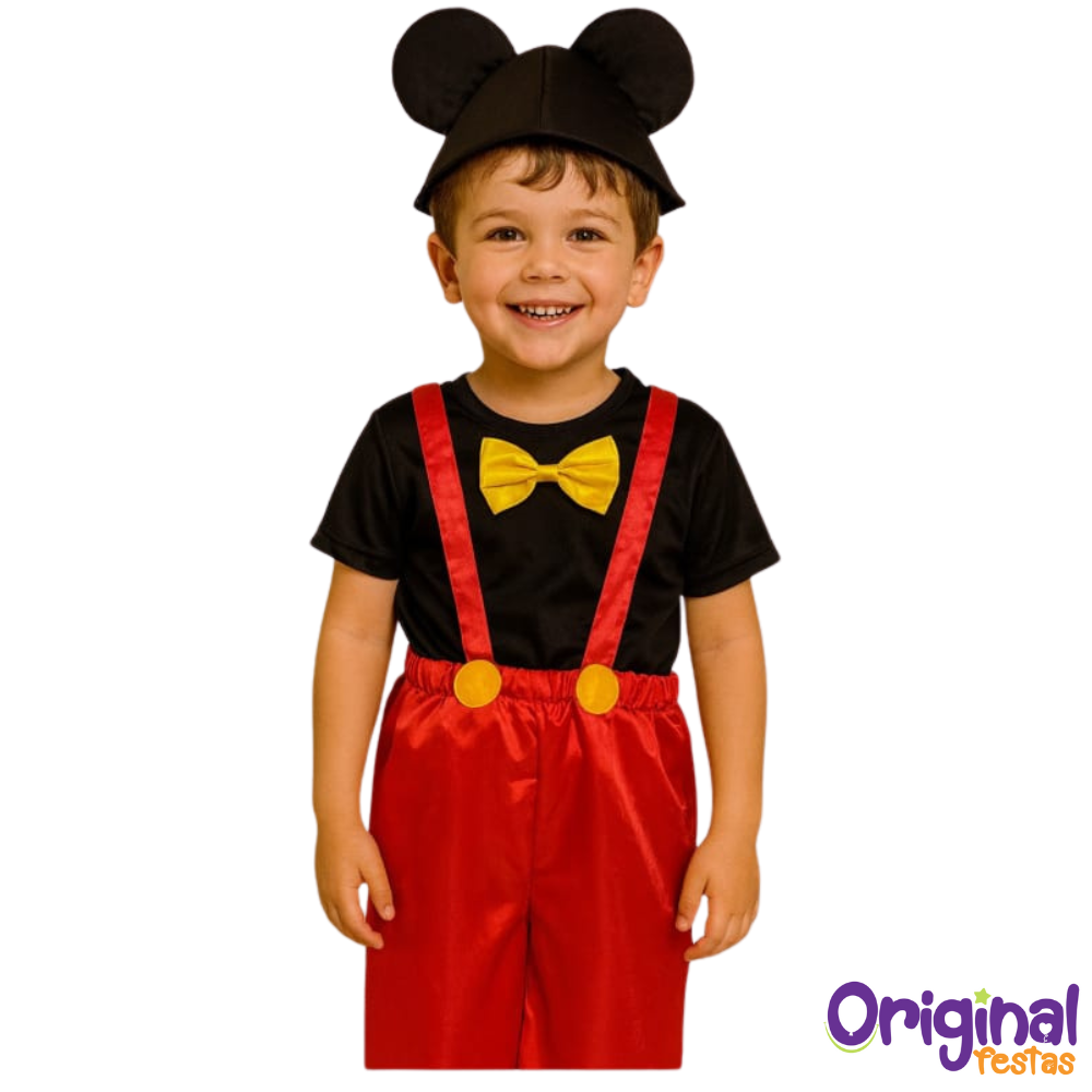 Composta por camiseta preta com gravata amarela e suspensórios vermelhos, bermuda vermelha com botões decorativos e chapeuzinho com orelhas, essa fantasia é perfeita para festas temáticas, apresentações escolares e momentos de brincadeira cheios de magia.