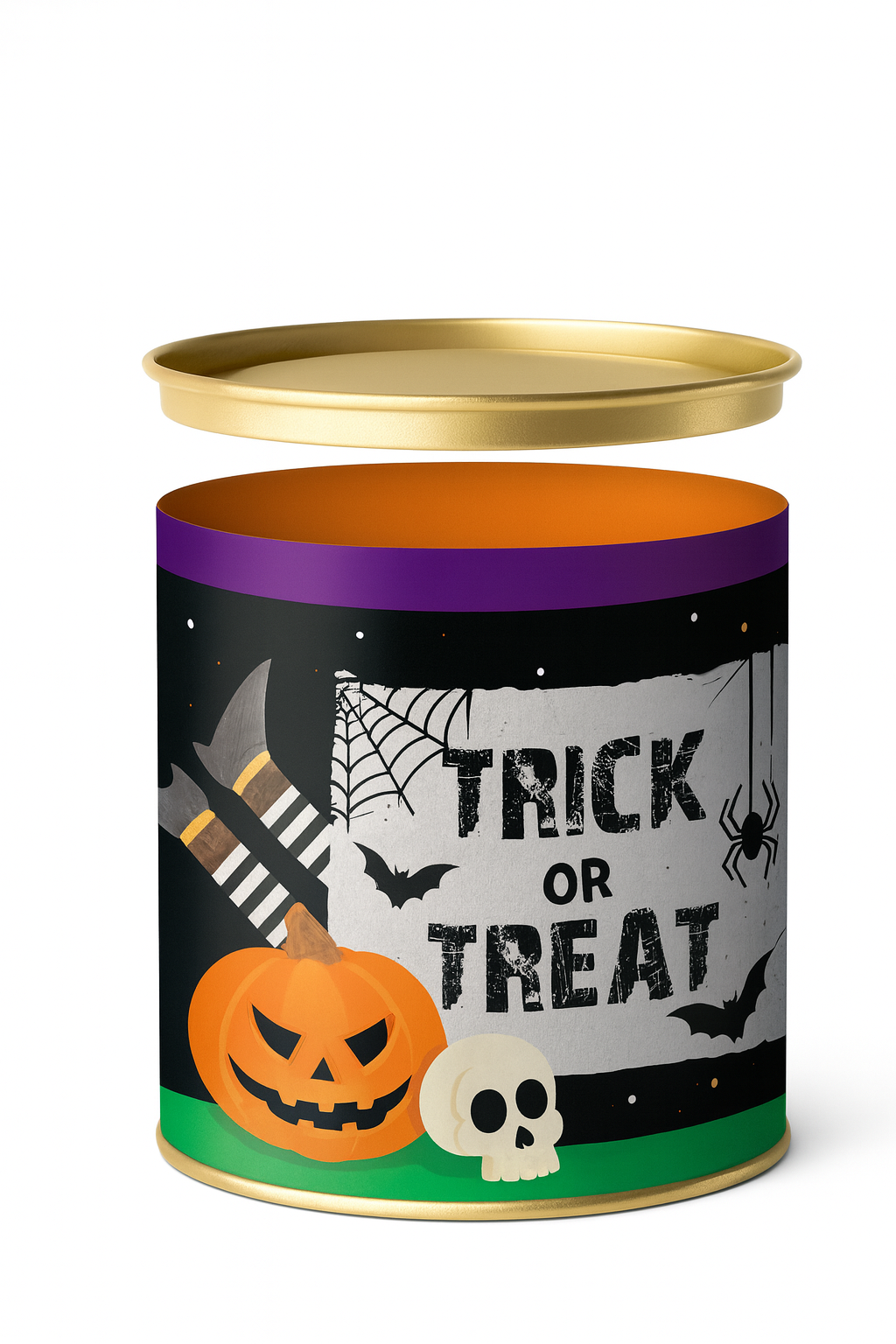 Descrição do Produto – Lata Decorativa Halloween "Trick or Treat" 🎃🕸️