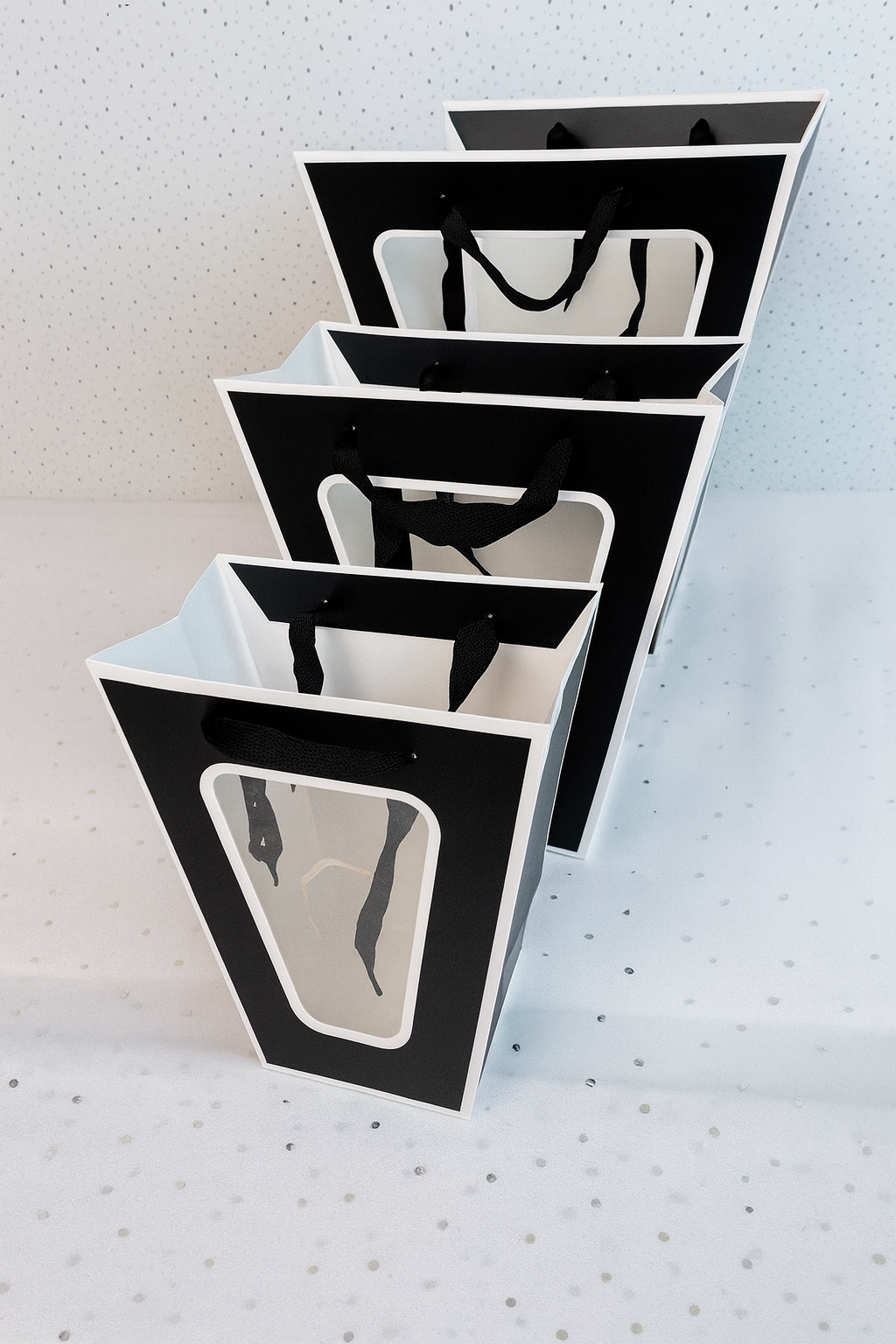 Elegância e praticidade em um só produto! Essa sacola luxo com visor transparente é perfeita para montar lembrancinhas, presentes, kits personalizados e produtos premium. Com design moderno nas cores preto e branco, traz um toque sofisticado e valoriza qualquer item que você colocar dentro.