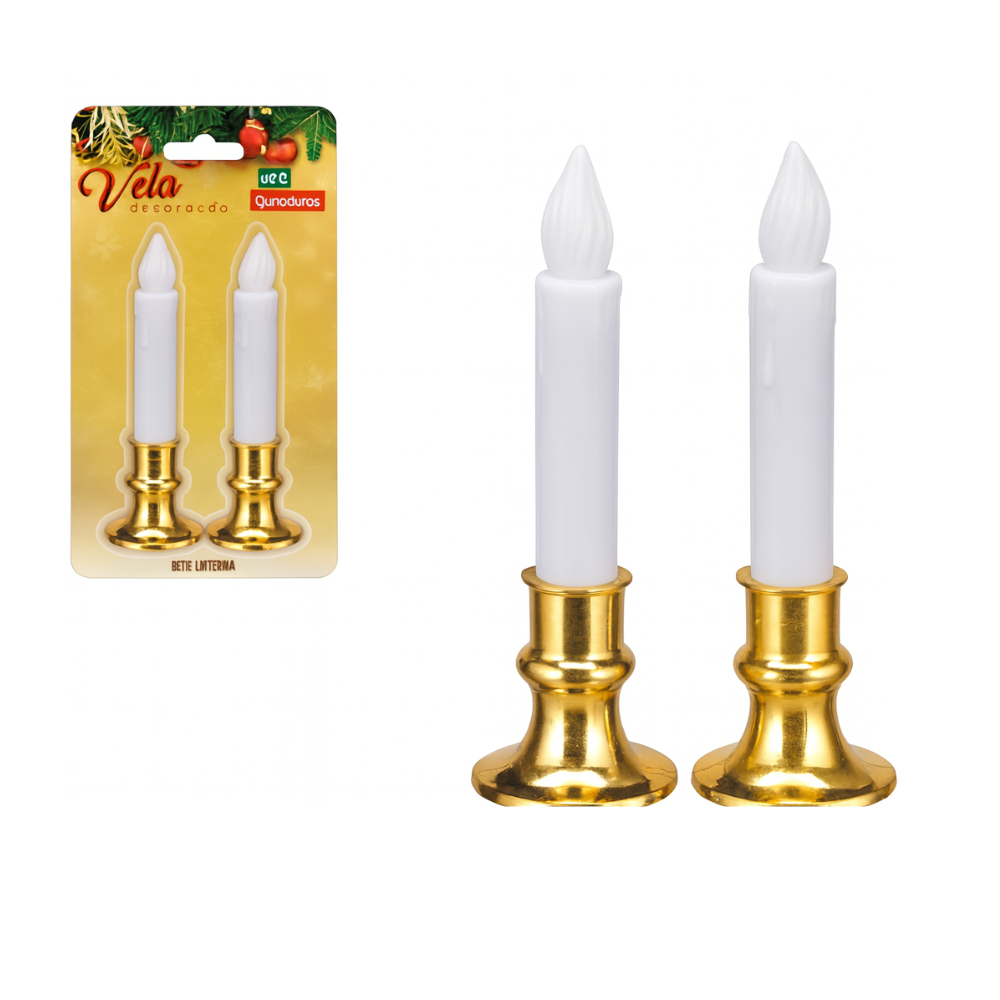 Cada vela possui base dourada brilhante e corpo branco clássico, com efeito de chama em LED, proporcionando um visual sofisticado e seguro, ideal para ambientes internos e decorações temáticas.