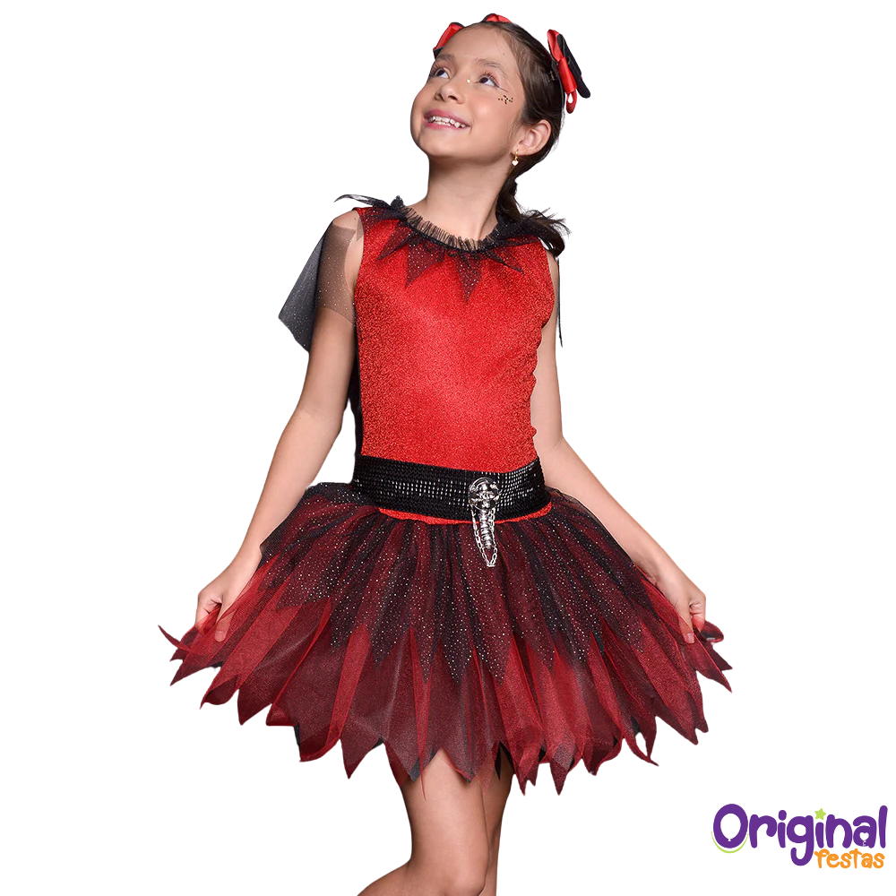Com um toque de elegância e mistério, o vestido combina o vermelho intenso com o preto cintilante, criando um visual digno de uma pequena vampira estilosa e poderosa.